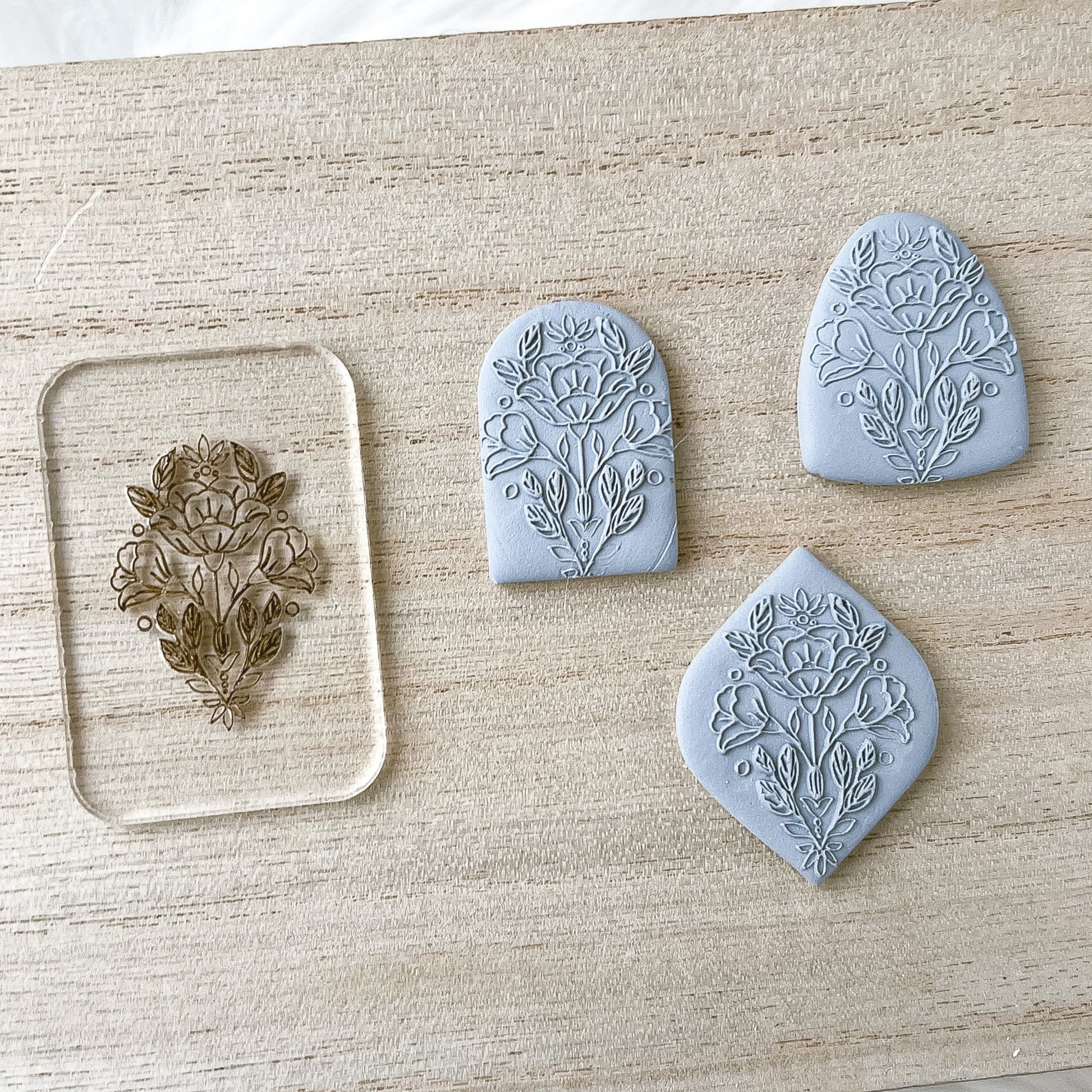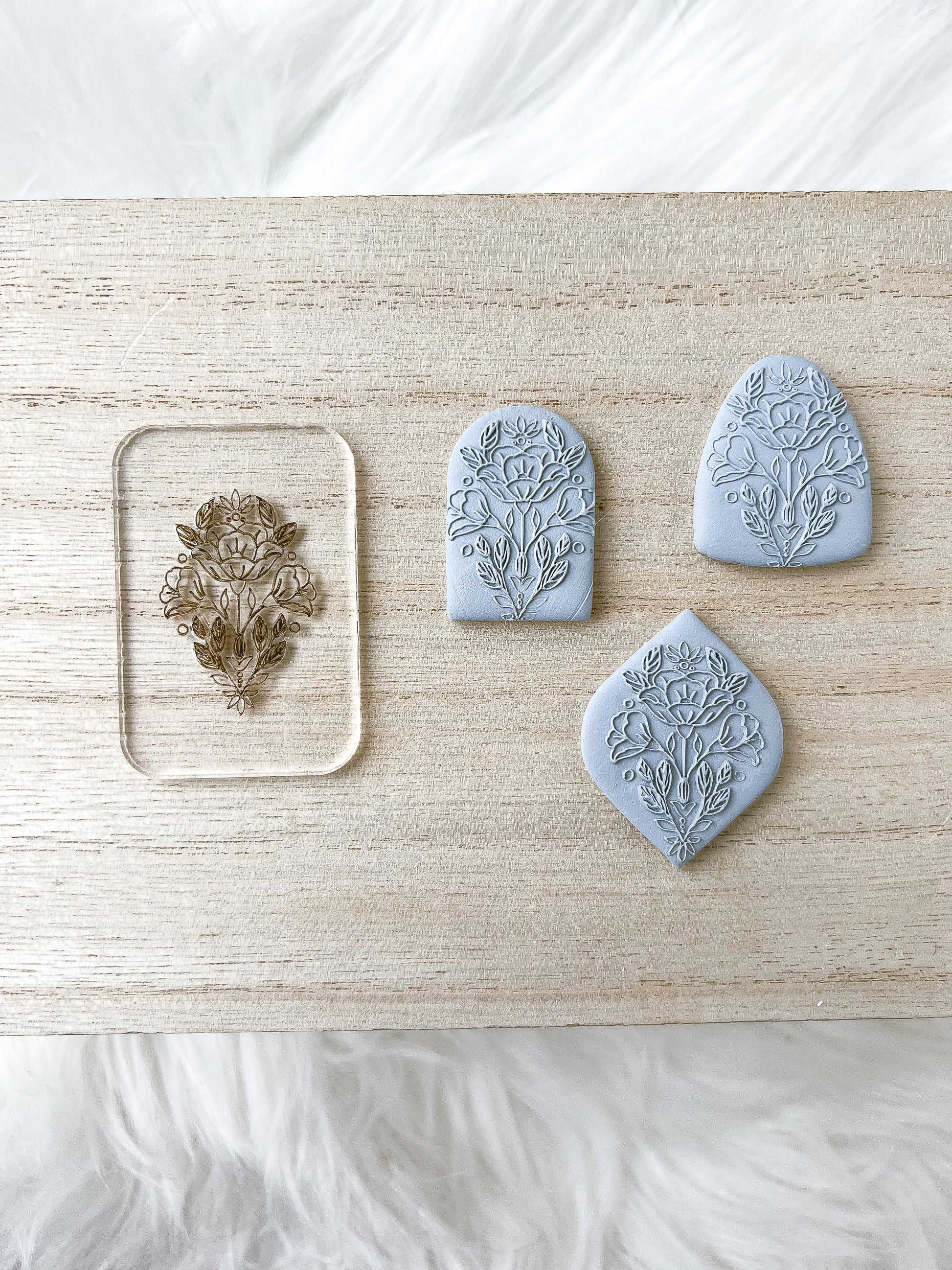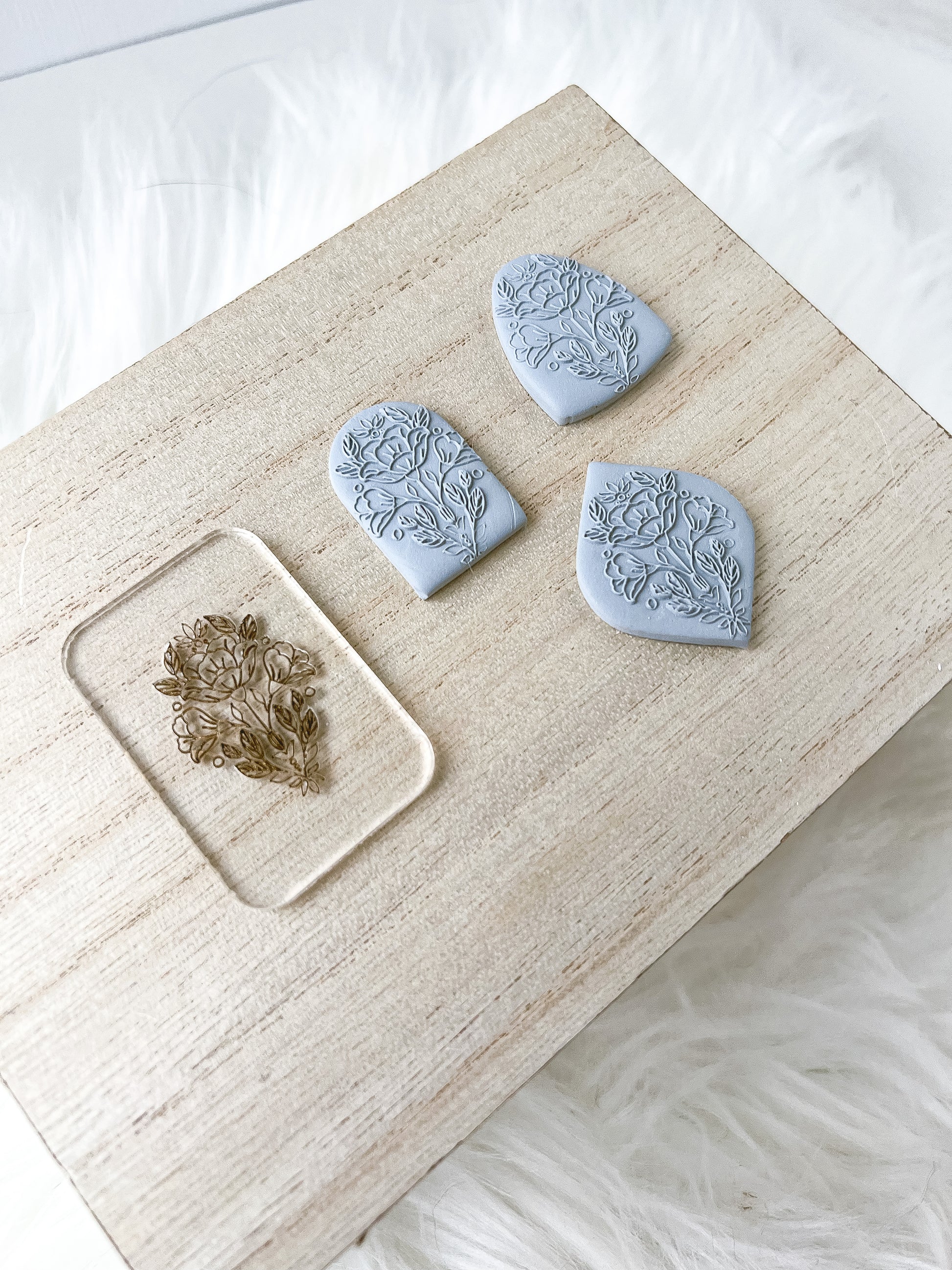 For best results, use 5mm or 6mm (preferred) depth guides. Roll clay through pasta machine, fold clay over. Place acrylic engraved side up and place folded clay over the acrylic texture. With the depth guides on each side, use your hand roller over the clay until level with depth guides. The slower, more gradual pressure will help with most accurate results! When clay has met the required depth, pull acrylic texture away from the clay. Lay out on your working surface and cut out as desired💜