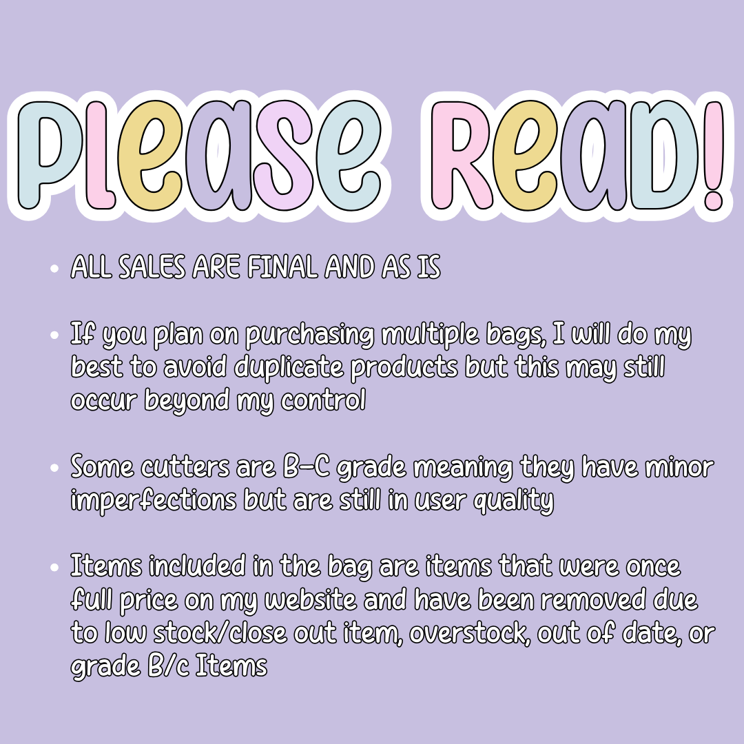 ALL SALES ARE FINAL AND AS IS If you plan on purchasing multiple bags, I will do my best to avoid duplicate products but this may still occur beyond my control Some cutters are B-C grade meaning they have minor imperfections but are still in user quality Items included in the bag are items that were once full price on my website and have been removed due to low stock/close out item, overstock, out of date, or grade B/c Items