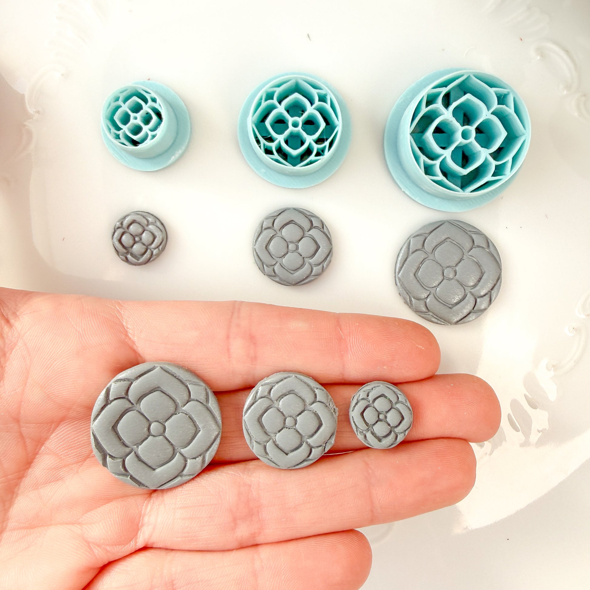 Roll clay onto a porcelain tile after conditioning. This will keep the clay on the tile and not inside the cutter. Press the cutting edge gently into your clay, making sure you cut all the way through the clay slab. You can slightly wiggle the cutter back and forth to push the surrounding clay away, making a cleaner cut edge.